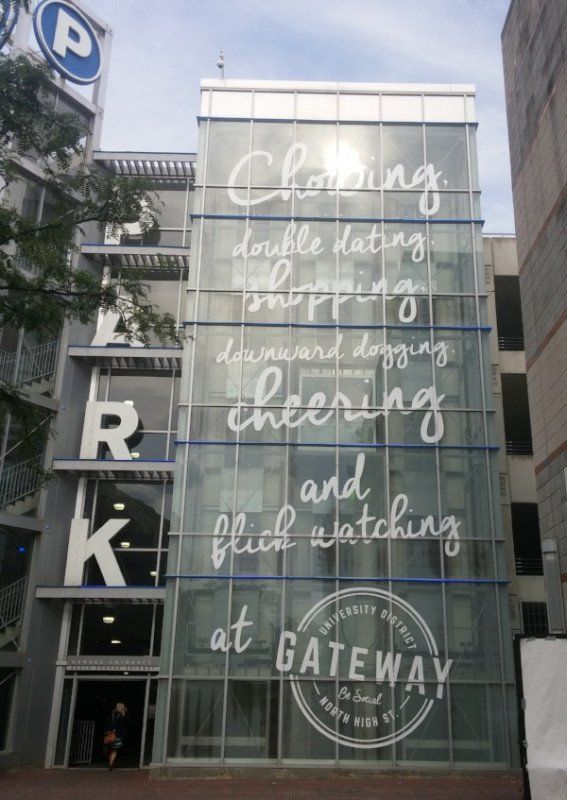 Customer wanted vinyl to be installed on elevator shaft that was adjacent to multi-level parking garage. Installed by SignAffects!